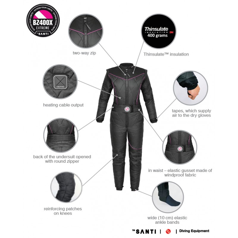 "Rata" BZ 400X, ahora con nuevo diseño deportivo, es el modelo más cálido de SANTI, considerado por muchos la mejor del mundo. Diseñada para el buceo con temperatura muy fría o largas decos. Ha sido desarrollado con la ayuda de los mejores buceadores e instructores.