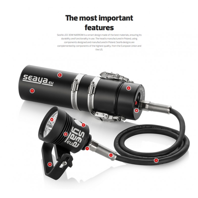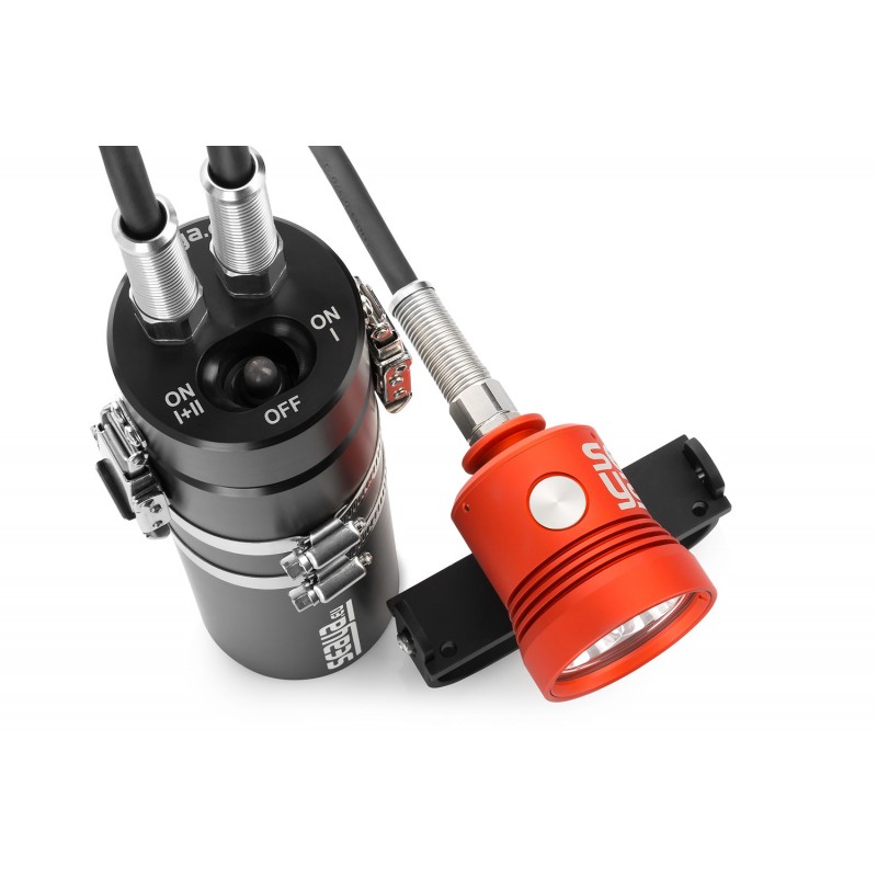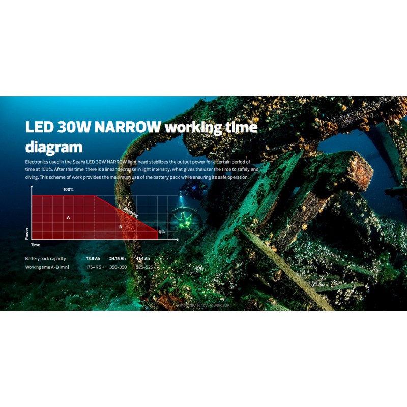 La linterna completa con batería NARROW está especialmente indicada para el buceo en cueva. Modelo sencillo de tres modos de uso (100%, 50% y OFF) personalizable con diferentes opciones, que proporciona 3600 lm a 5700º Kelvin, para una temperatura de color más cercana a la lus del día. Una lámpara sofisticada, capaz de contentar al buzo más exigente.
