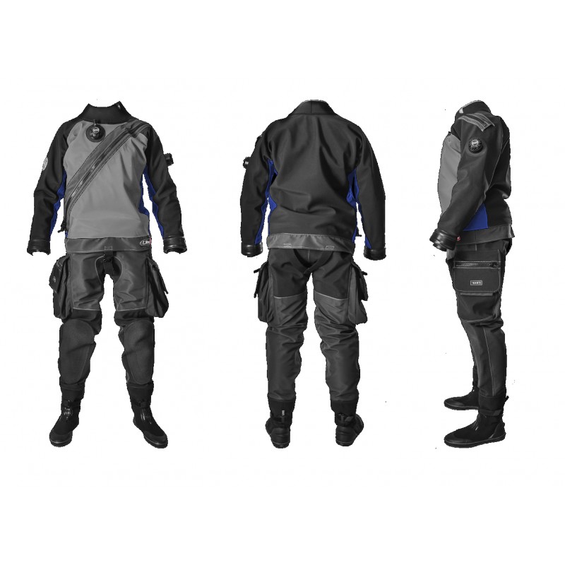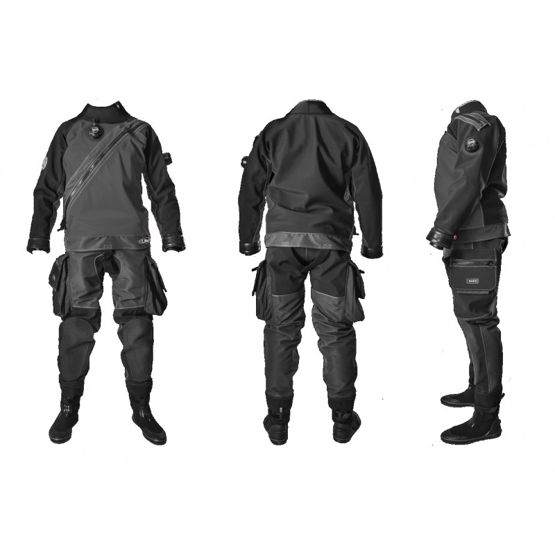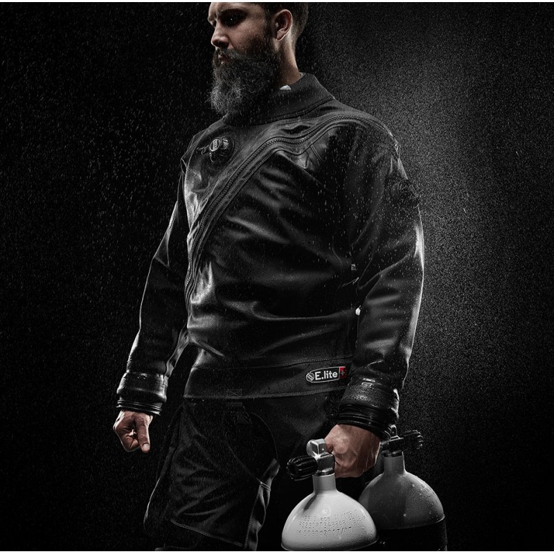 El traje seco eLite+ es una evolución del eLite con todas las características que se necesitan para el buceo profesional, técnico y espeleobuceo. Construido con una larga cremallera estanca de plástico de entrada frontal, cubierta por una solapa adicional con cremallera, nueva forma de rodilleras de Kevlar ® para proteger adicionalmente el área delantera de la pierna.